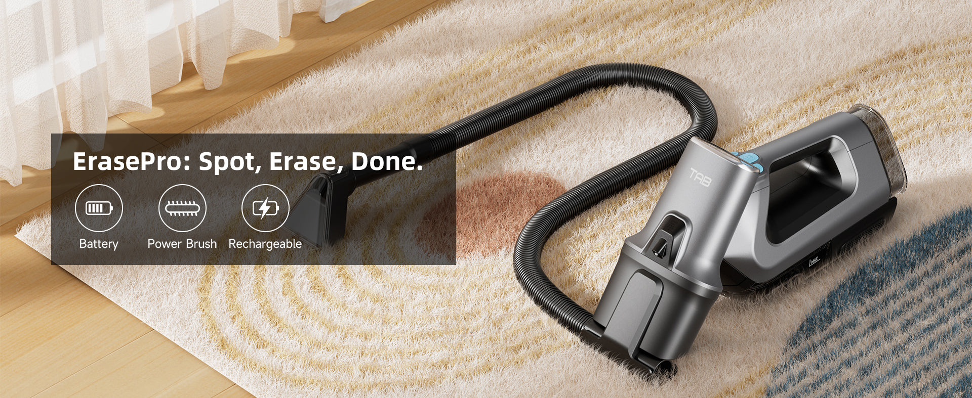 Spray, scrub and suction, TAB ErasePro can always keep your carpet clean.