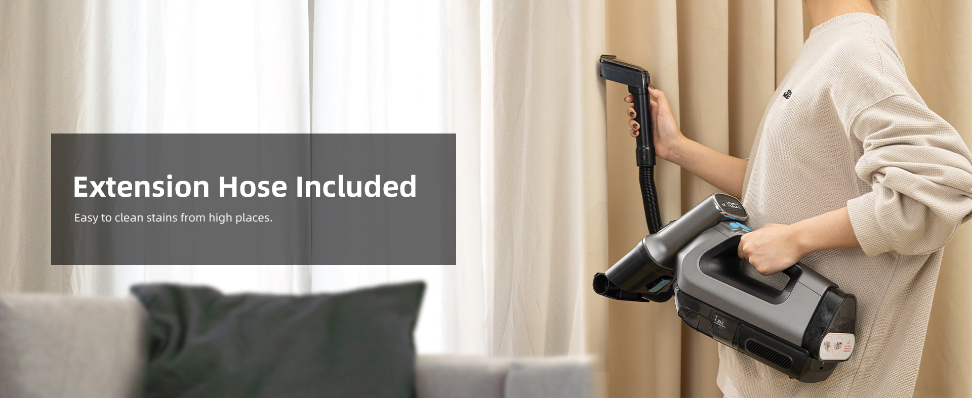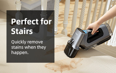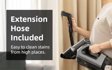 - 【PowerBrush & Extend Hose】One of the standout features of the TAB Wireless Spot Cleaner is its PowerBrush, which can helps to agitate and lift dirt and stains from deep within the fibers of your carpets and upholstery. You can choose to turn on or off the power brush independently through the button on the body. The Extend Hose is another great feature that allows you to easily clean hard-to-reach areas such as crutains, stairs, corners, and crevices.