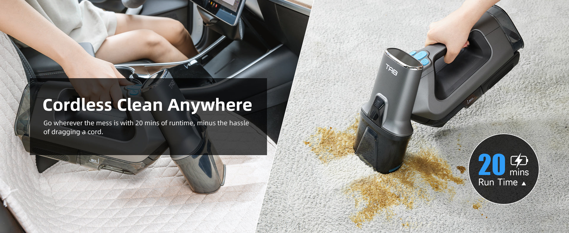 - 【Cordless & Rechargeable】The wireless design of this carpet cleaner machine makes it easy to move around your home or office without any cords or wires getting in the way. The TAB wireless spot cleaner is powered by a battery that provides up to 20 minutes of runtime, allowing you to clean multiple surfaces without the need to constantly recharge.